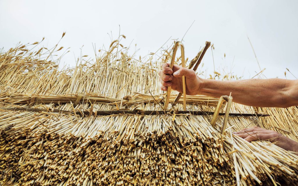 - Aantrekken en verstevigen: Het riet wordt opnieuw strak vastgezet, zodat het dak weer stevig in model ligt en goed aansluit.
